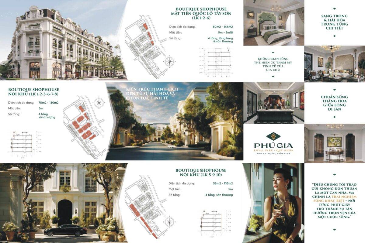 Các sản phẩm Shophouse nằm ở vị trí trung tâm, hưởng trọn tiện ích và dòng khách nội khu ổn định của Phú Gia Royal Park Quy Nhơn, lý tưởng cho các dịch vụ tiện ích, nhà hàng, và cửa hàng nội bộ:
